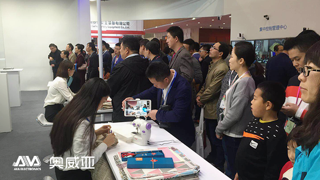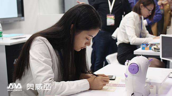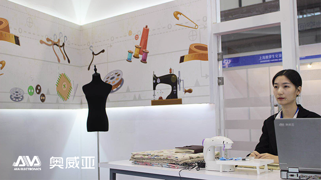 智慧實訓(xùn)空間是本次展會最火爆的奧威亞區(qū)域,圍觀人員絡(luò)繹不絕,大家都對“智慧實訓(xùn)”這一新穎的教學(xué)形式產(chǎn)生了濃厚興趣。在智慧實訓(xùn)空間里,有2名的學(xué)生坐縫紉機前,專注地進行著縫紉訓(xùn)練。?