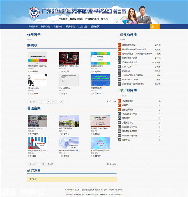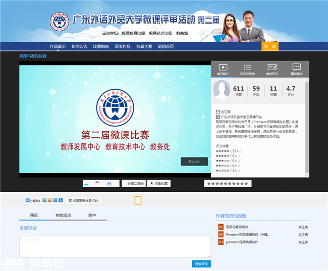 廣外深知微課大賽會(huì)涉及多項(xiàng)繁雜的步驟工作,并找到知名錄播廠家奧威亞。針對(duì)廣外的實(shí)際情況,奧威亞在應(yīng)用平臺(tái)上專門設(shè)計(jì)打造了微課比賽活動(dòng)的欄目,將傳統(tǒng)的評(píng)課步驟一一簡化?,F(xiàn)在,評(píng)課專家可以在線上完成所有的評(píng)課步驟,再也不用看到厚厚的紙質(zhì)評(píng)價(jià)表了~