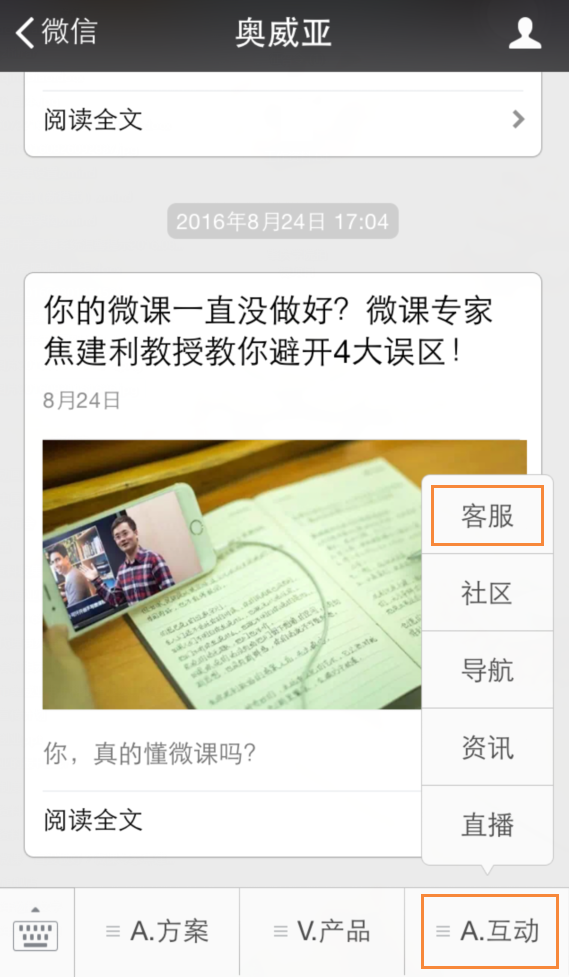 關(guān)注奧威亞的官方微信,點擊微信底部菜單【A.互動】-V客服】即可體驗。