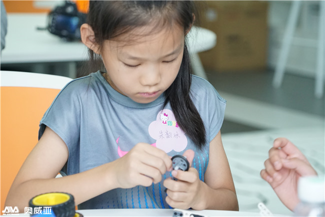 而第二小組,7歲到10歲的孩子則會交給專業(yè)的輔導(dǎo)老師,挑戰(zhàn)難度更高的戰(zhàn)車樂高玩具。第二組的戰(zhàn)車模型的樂高玩具是一個包括塑料積木、電子模塊、手動遙控器等幾十種零件的工程積木。孩子可以在家長、輔導(dǎo)老師的指引下,充分發(fā)揮自身的空間想象能力和動手操作能力,將零散的積木變成可移動、可遙控的戰(zhàn)車玩具。