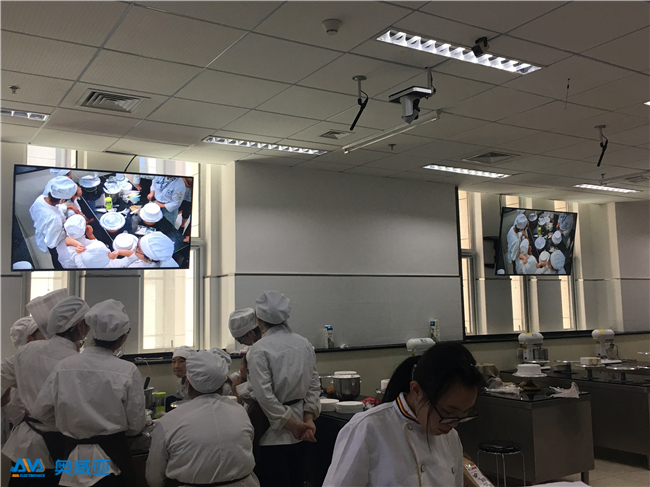 實(shí)訓(xùn)基地主要供學(xué)生學(xué)習(xí)、訓(xùn)練西點(diǎn)西餐制作技能使用。老師只需站在帶有奧威亞全高清云臺(tái)攝像機(jī)的工位上進(jìn)行示范操作,學(xué)生們就可以通過(guò)課室里的高清大屏方便地觀看與學(xué)習(xí),而不需要里三層外三層地圍著老師。這種做法,避免了傳統(tǒng)實(shí)訓(xùn)中因場(chǎng)地、人數(shù)等限制因素而產(chǎn)生的教學(xué)質(zhì)量下降的問(wèn)題。